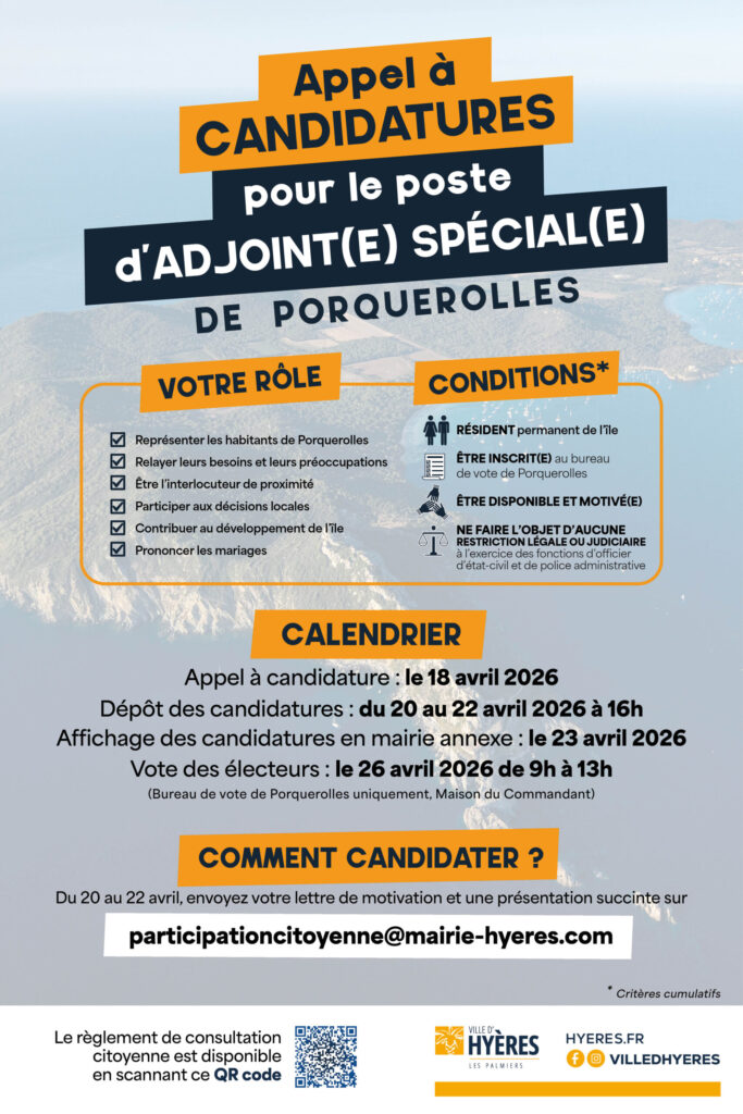 L’île de Porquerolles est l’une des 10 fractions hyéroises pour laquelle il convient de désigner un Adjoint spécial. Au-delà de la procédure réglementaire attribuant au conseil municipal la compétence de désignation de cet adjoint spécial, la Municipalité tient également à associer les résidents de l’île à la désignation de cet Adjoint.