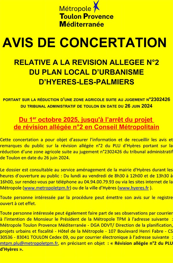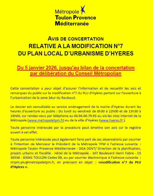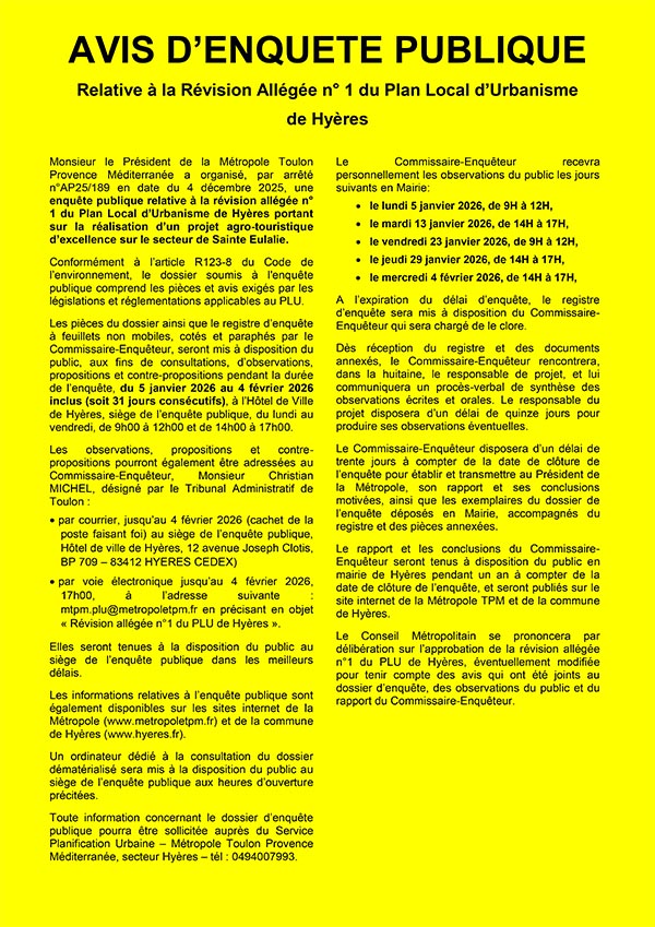 Par arrêté N° AP 25/189 en date du 04 décembre 2025, M. le Président de la Métropole T.P.M. a prescrit et organisé, une enquête publique portant sur la révision allégée n°1 du PLU de la Commune d’Hyères