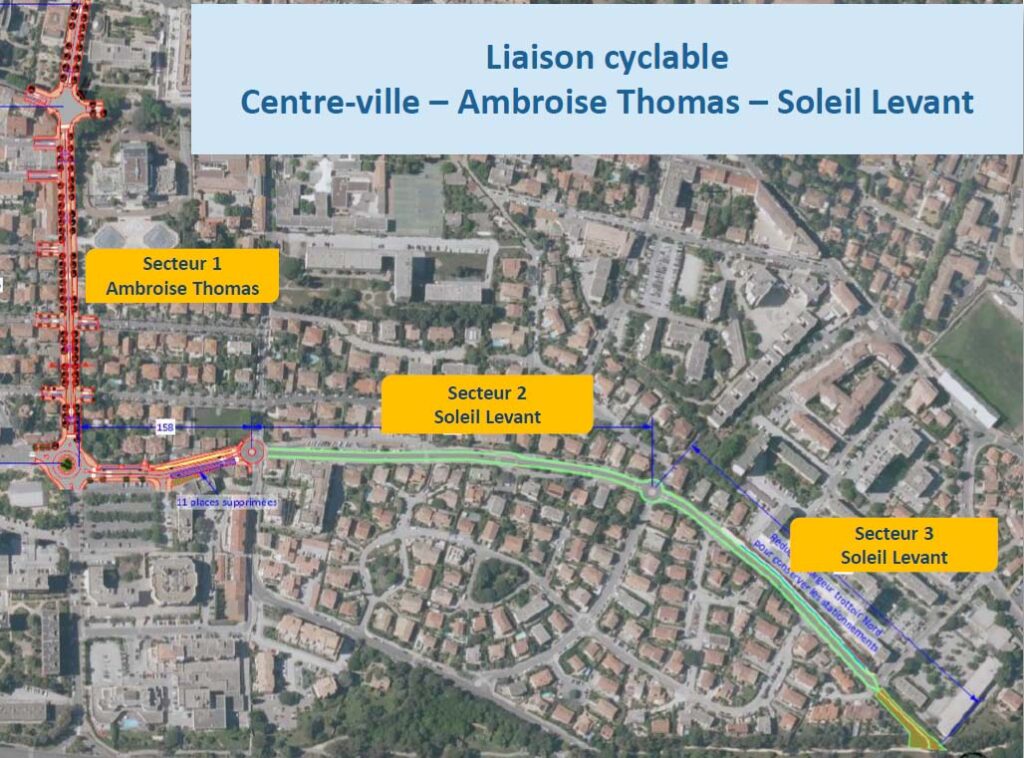 Dans la continuité de la voie verte aménagée récemment sur l’Avenue Léopold Ritondale, une piste cyclable sera aménagée sur la rue du Soleil Levant et l’Avenue Ambroise Thomas. Le projet porte la réfection de la chaussée avec la création d’une bande cyclable sur l’Avenue Ambroise Thomas jusqu’au barreau nord de la Place Louis Versin, ainsi que la rue du Soleil Levant.