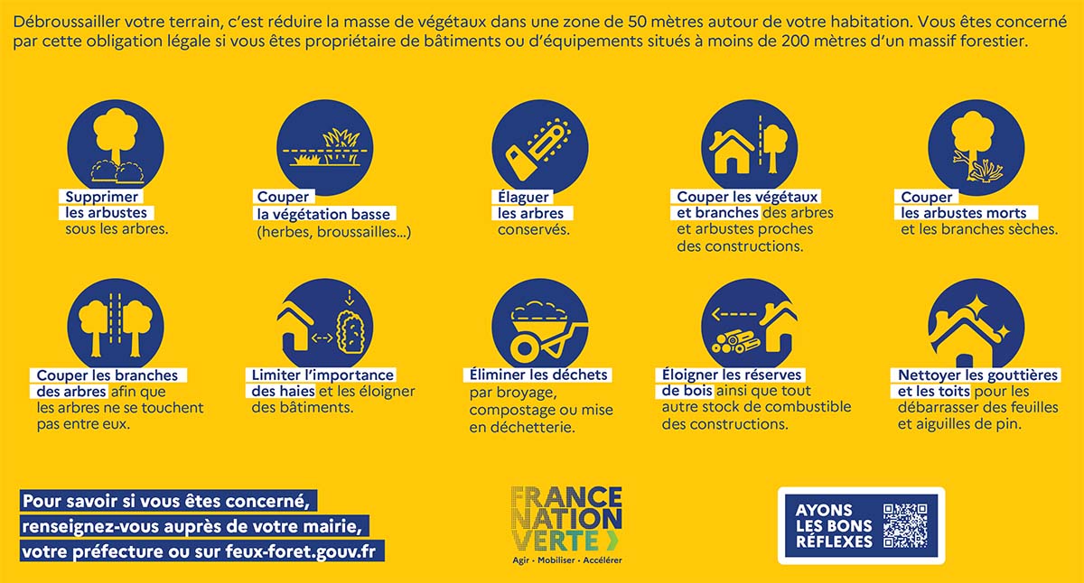 - Le débroussaillement est OBLIGATOIRE, particulièrement dans notre région où les risques d’incendies ou de feux de forêts sont très importants.